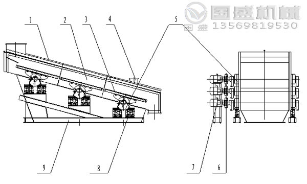 產(chǎn)品結(jié)構(gòu) ![]() 1.密封罩 2.篩箱 3.篩板 4.除塵口 5.激振器 6.軟連接裝置 7.電動機(jī) 8.減振彈簧 9.底托